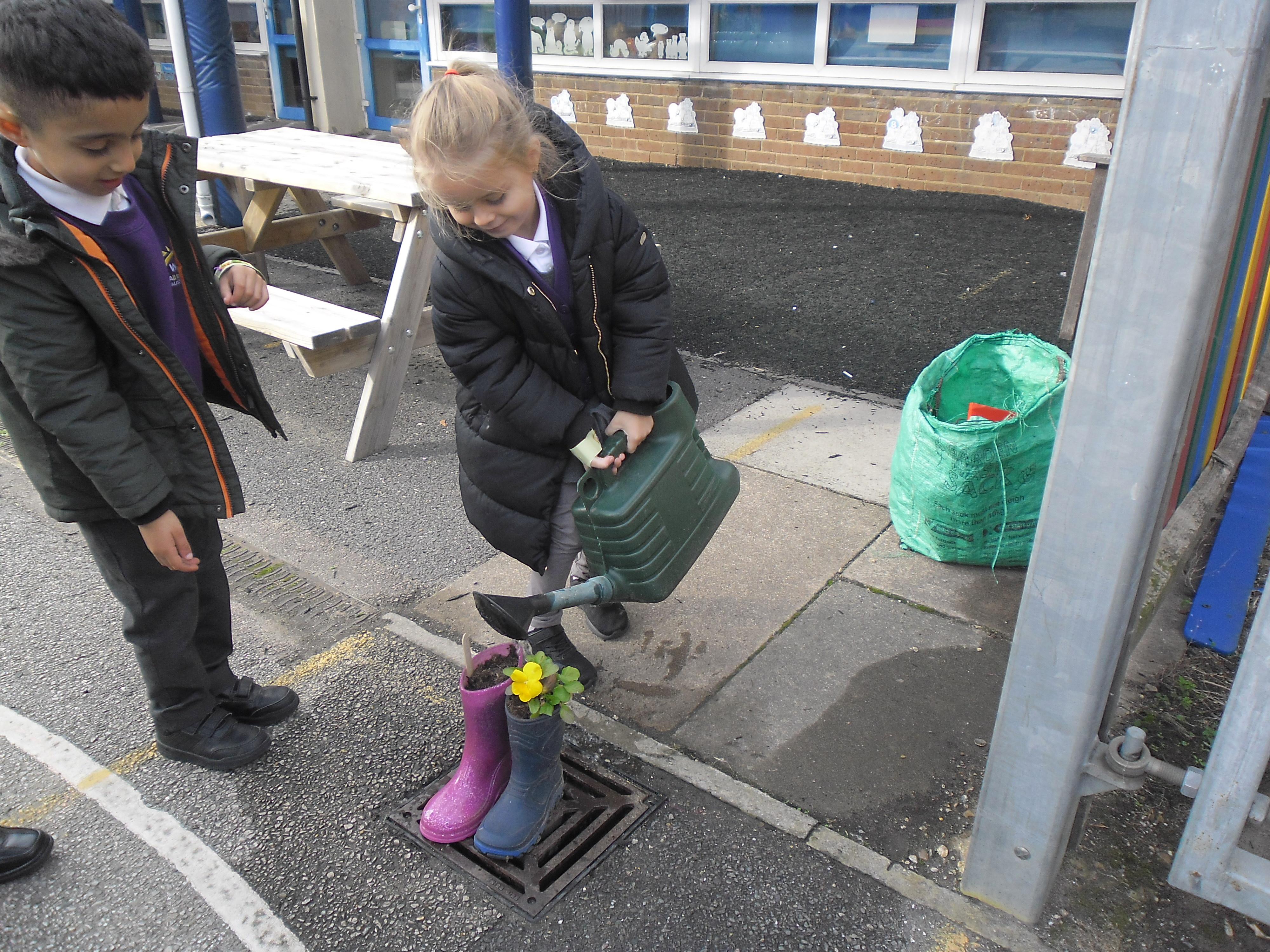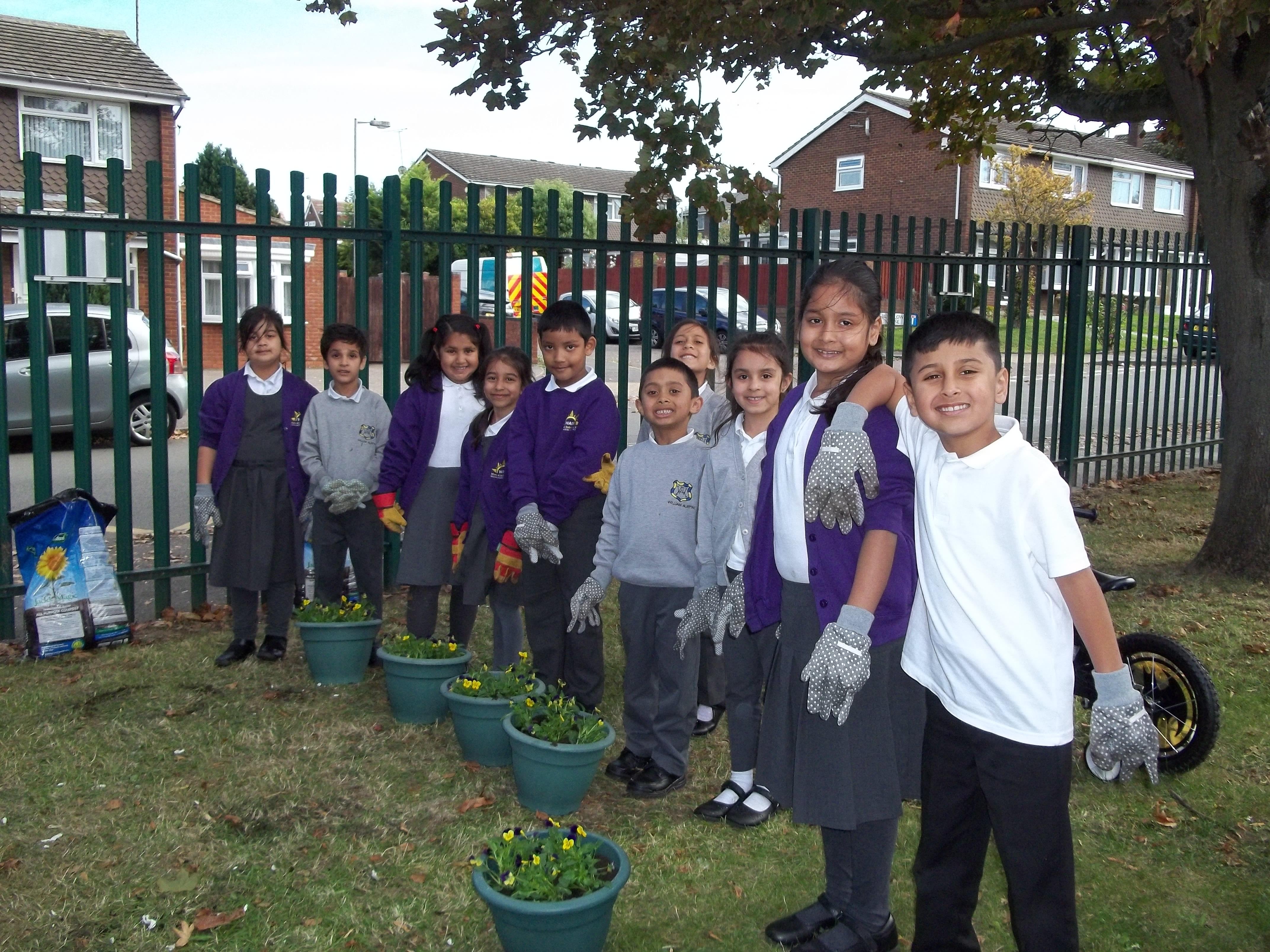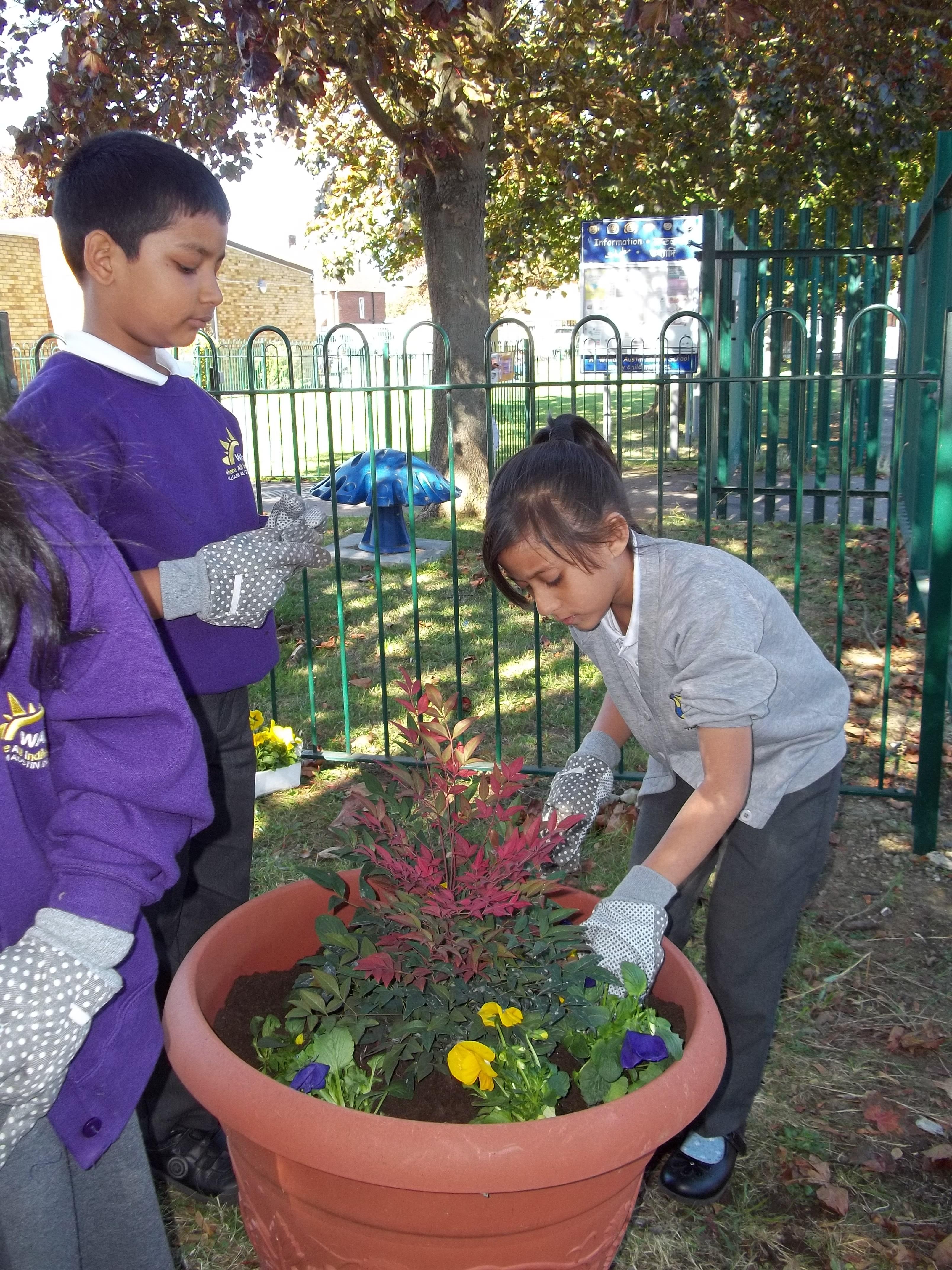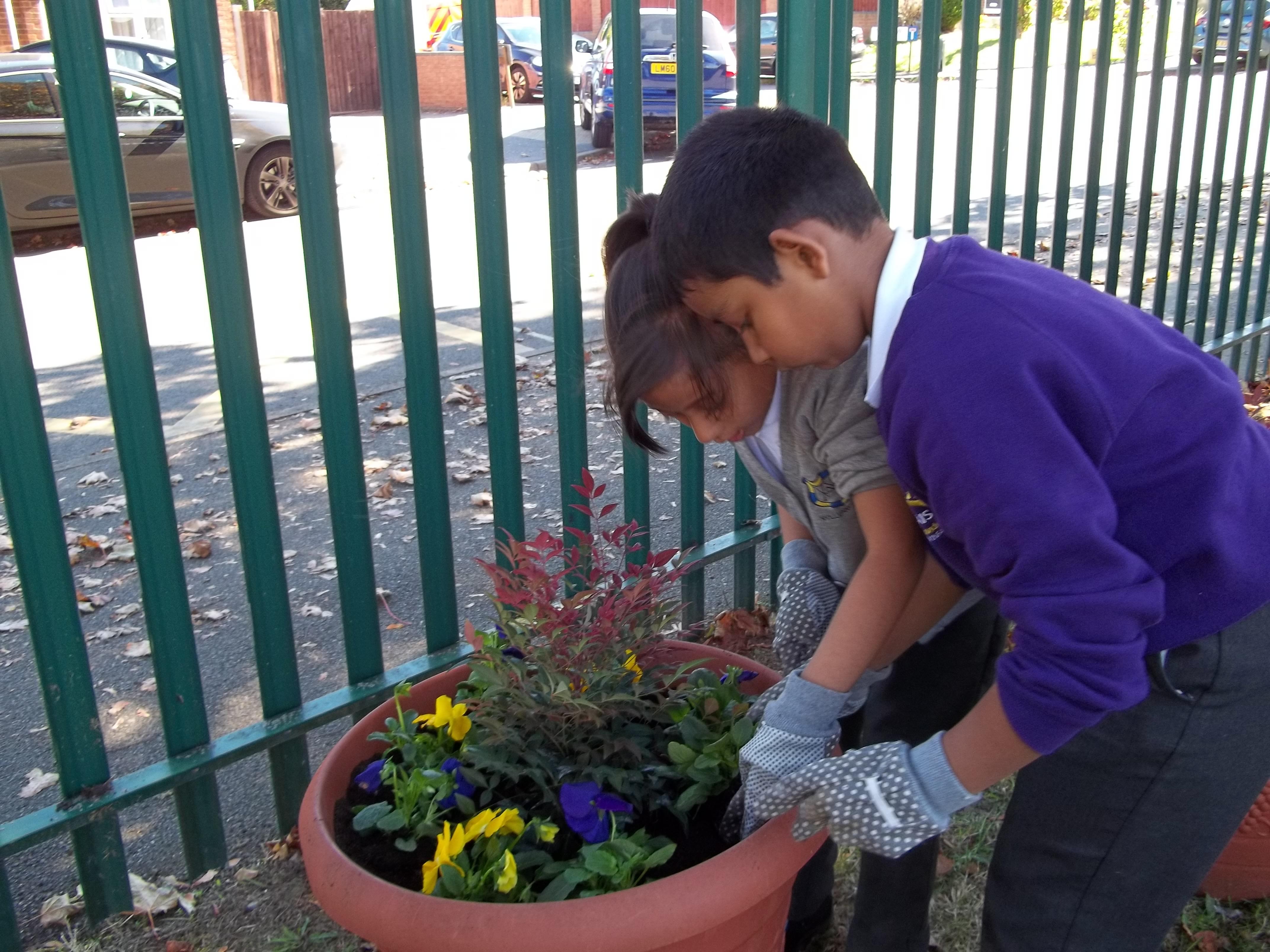 • 20 children, 2 from each Year 1 and 2 class worked together to create a planter to welcome children, parents and visitors to their class using violas which reflected our new school uniform colours purple and yellow called "yellow jump up".
