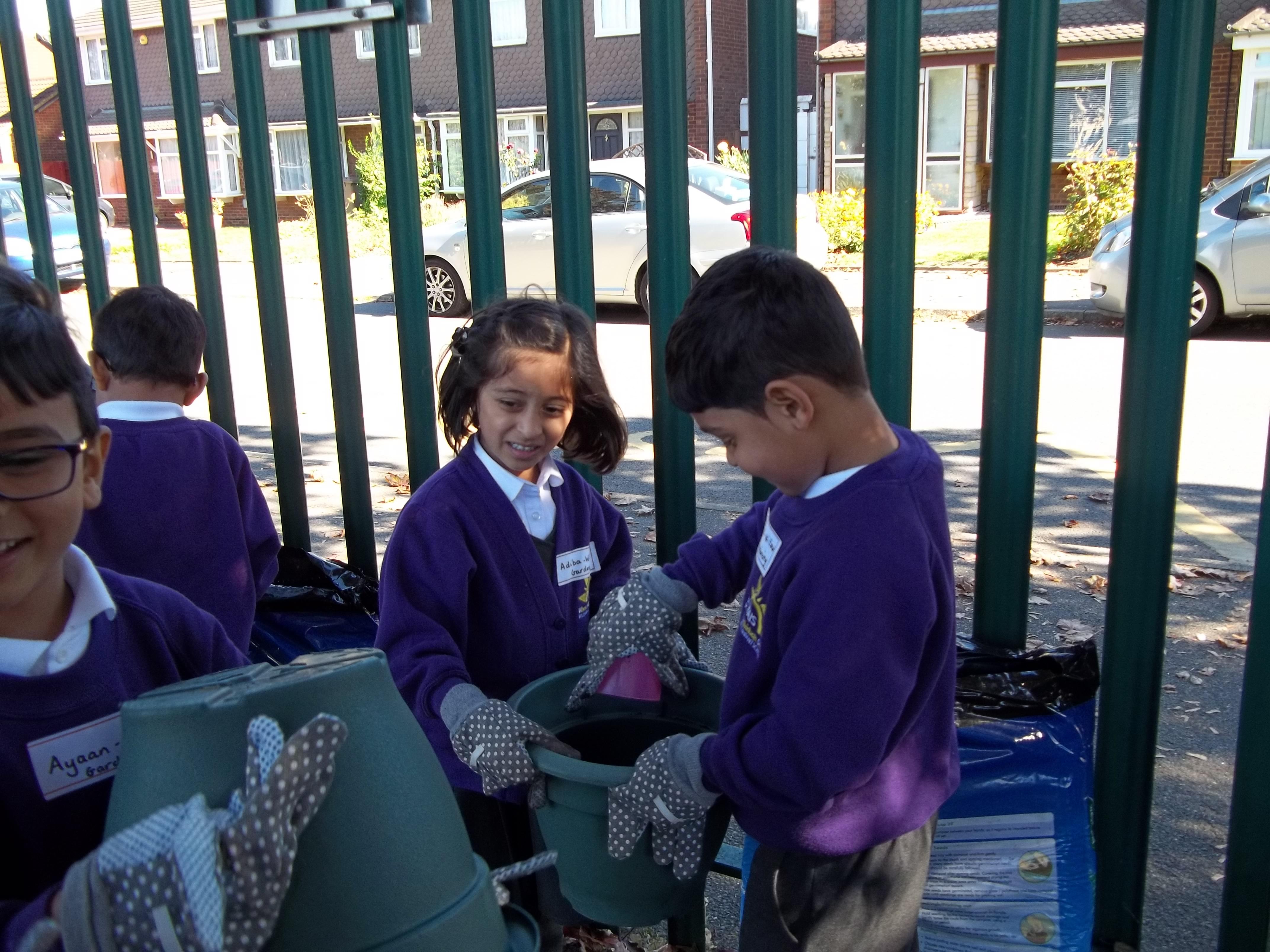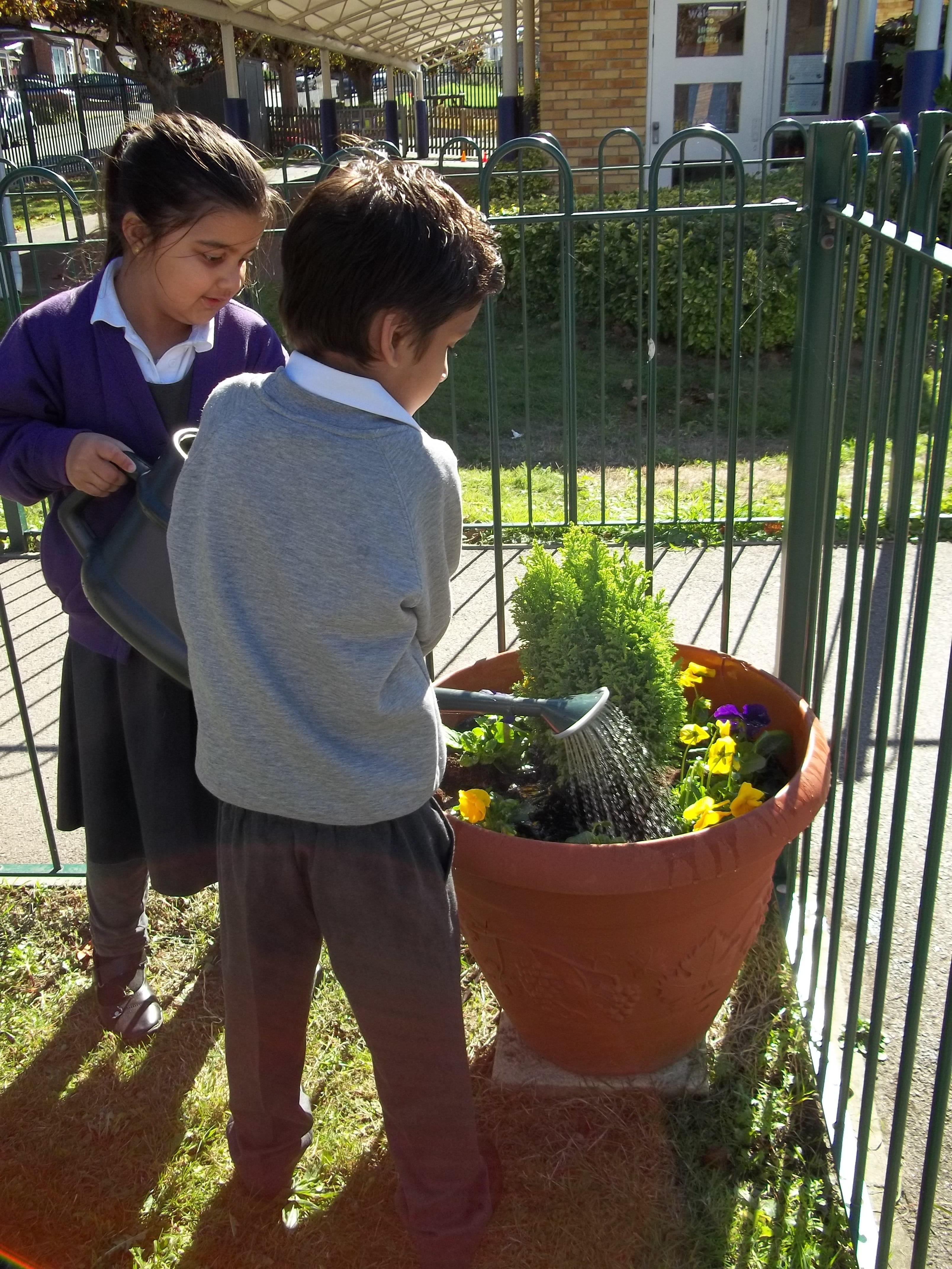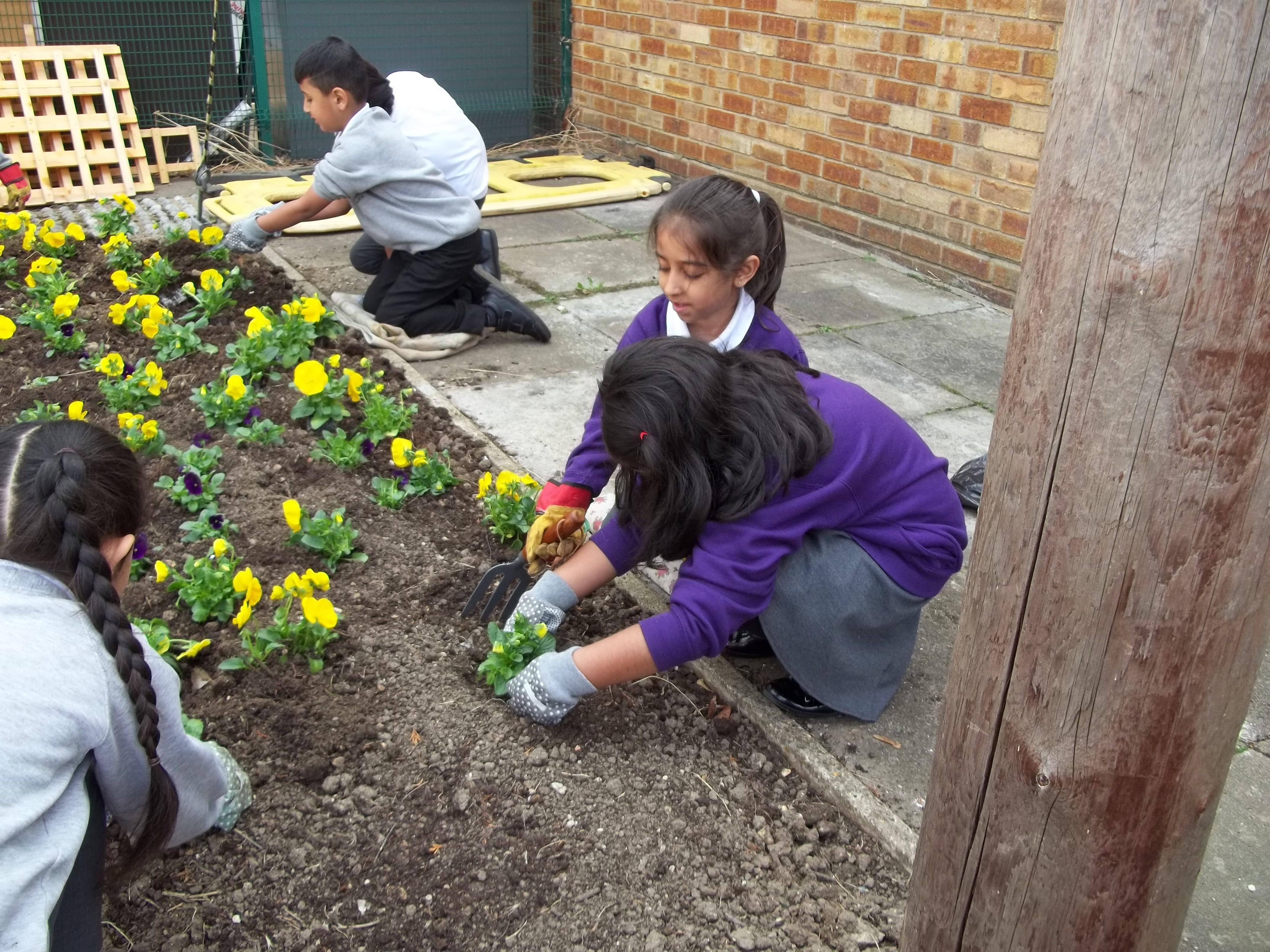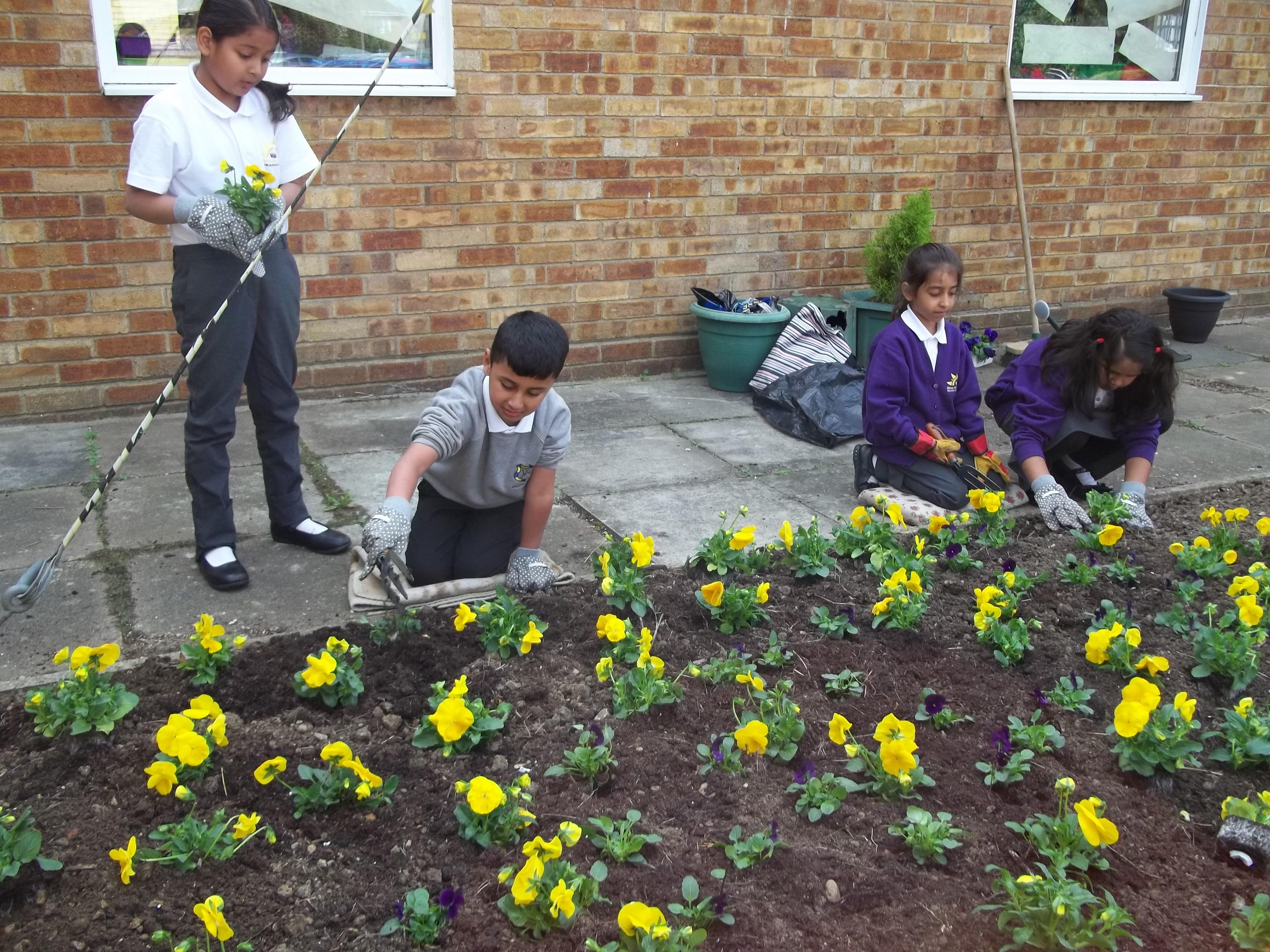 • 20 children, 2 from each Year 1 and 2 class worked together to create a planter to welcome children, parents and visitors to their class using violas which reflected our new school uniform colours purple and yellow called "yellow jump up".