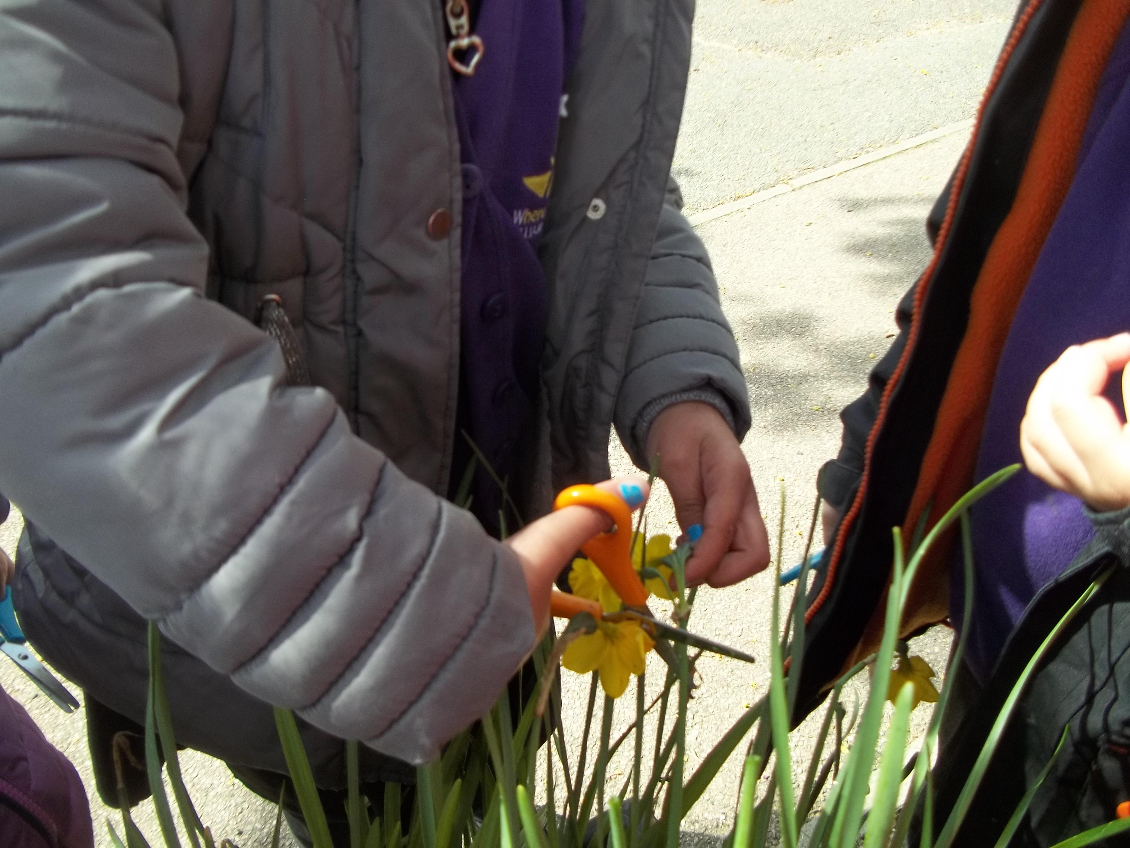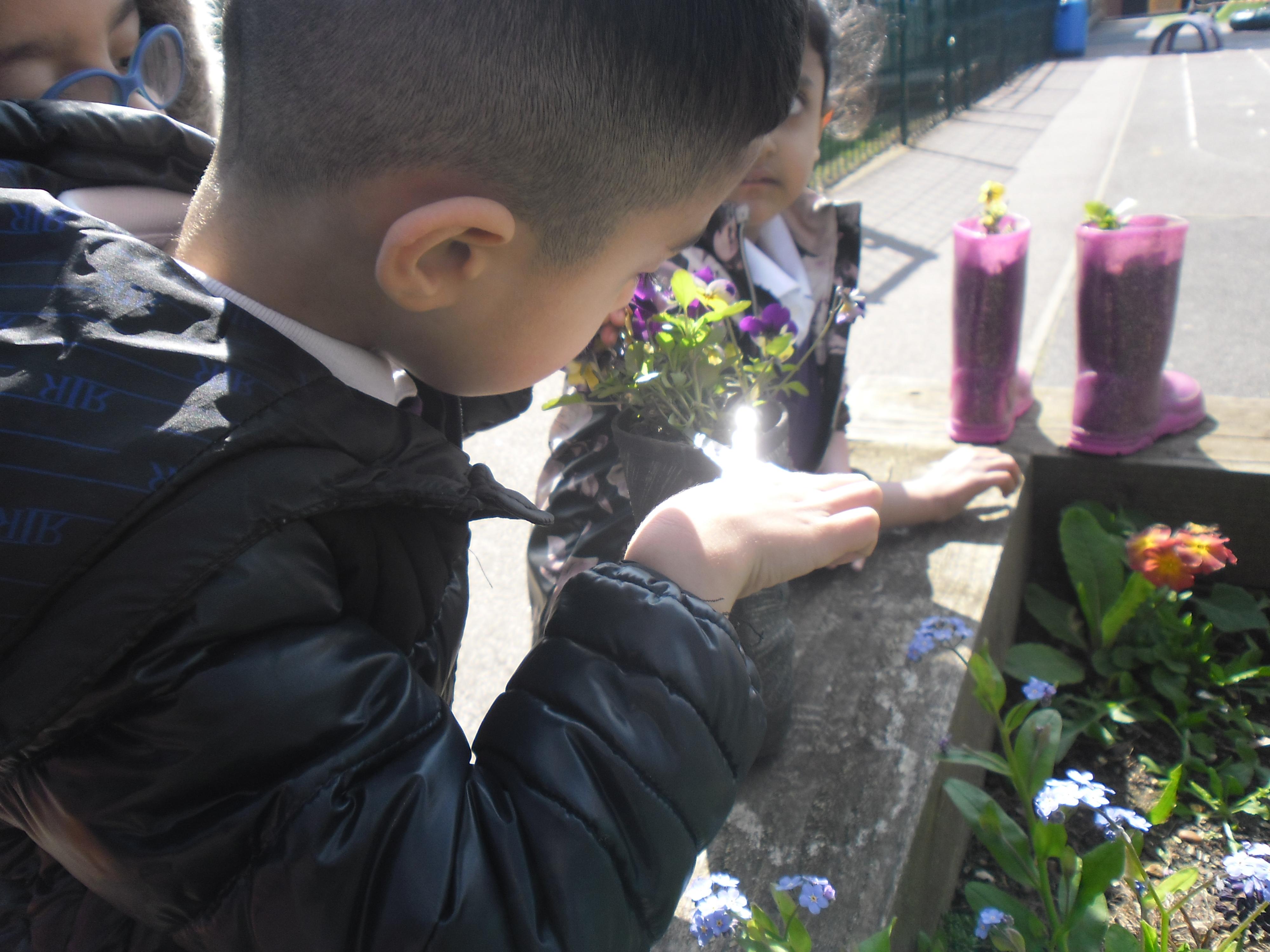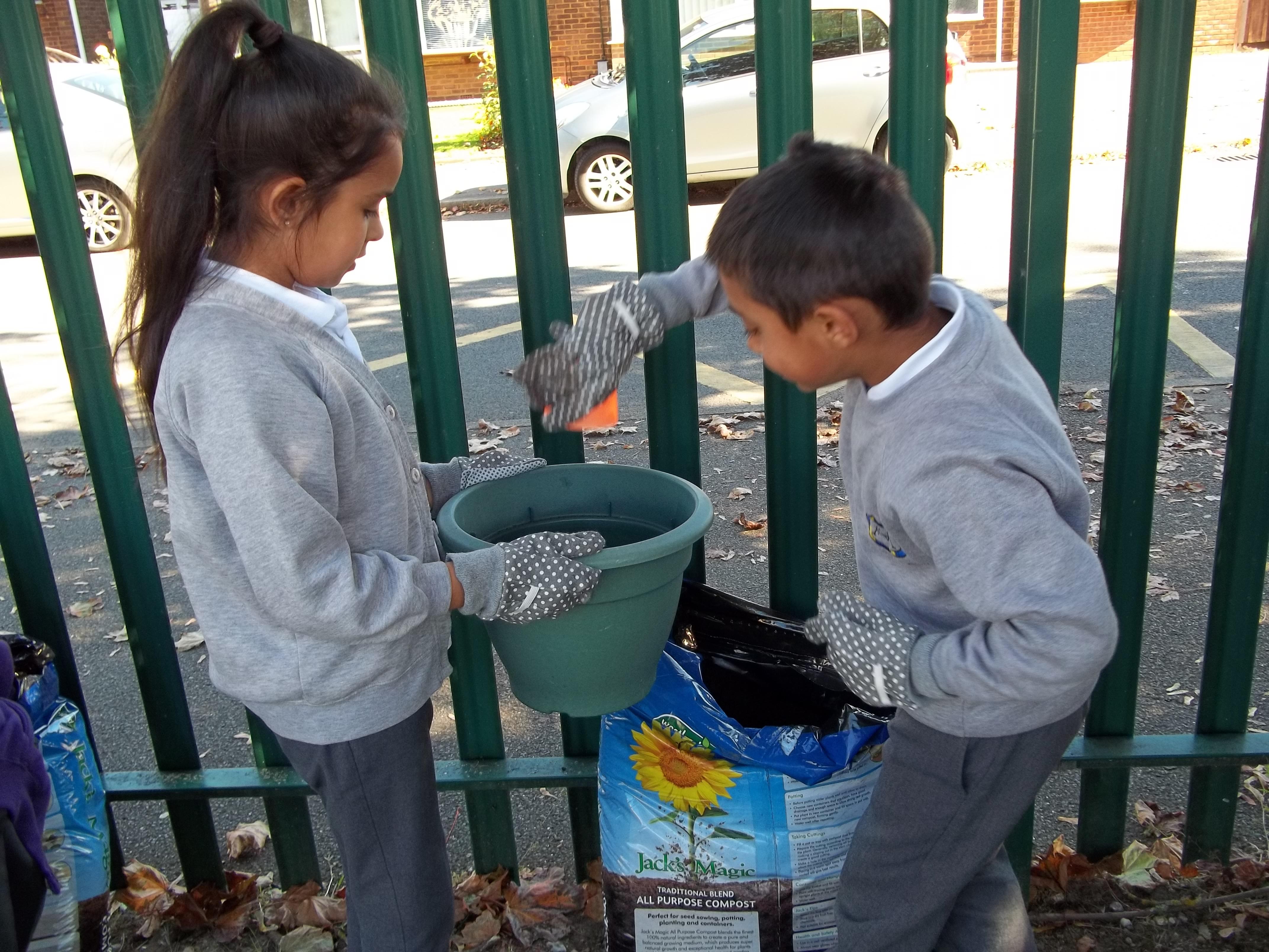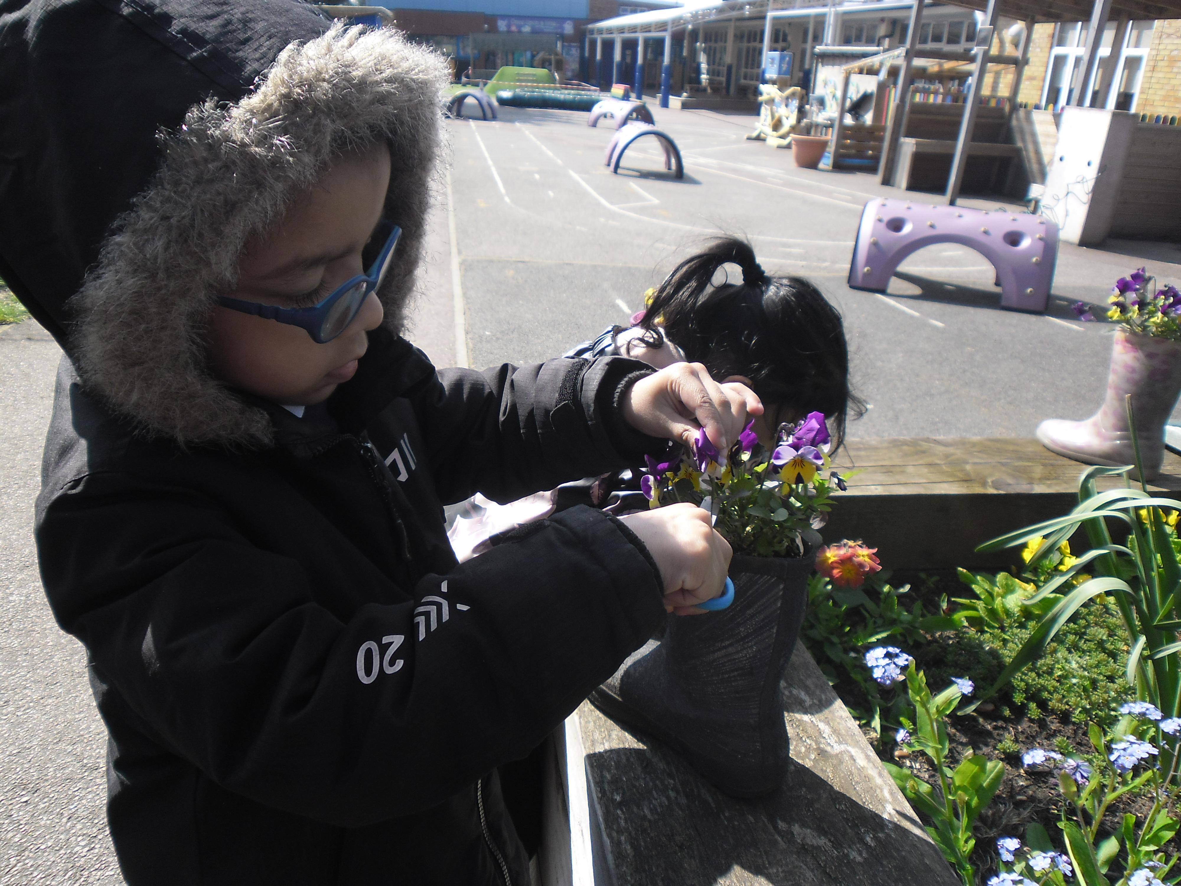 • 20 children, 2 from each Year 1 and 2 class worked together to create a planter to welcome children, parents and visitors to their class using violas which reflected our new school uniform colours purple and yellow called "yellow jump up".